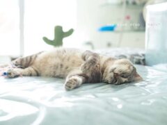 えぇえぇ、写り込んでいるサボテン型の爪とぎポールがどえらいボロになっているよ。